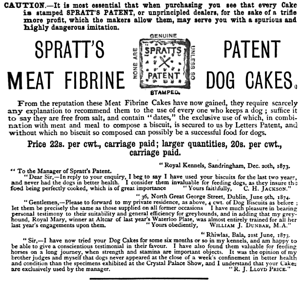 1876_ad_for_Spratt’s_Patent_Meat_Fibrine_Dog_Cakes