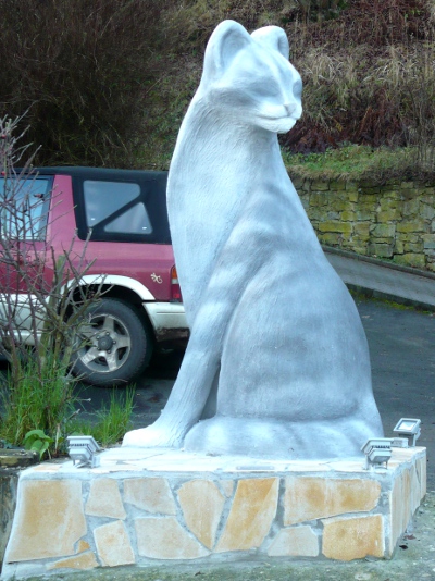 Neulich haben Wolfgang und Heidi einen Ausflug gemacht und sind auf eine riesige Spelunke am Ufer der Fulda gestoßen. Da gibt es in Stein gehauene Abbilder von Rabauke und einer grauen Katze, deren Rolle mir noch nicht bekannt ist (vielleicht sind es ja auch Rotbart und Graulocke, denen hier ein Denkmal gesetzt wurde?). Und als Gastgeber begrüßt ein leibhaftiger roter Kater die menschlichen Besucher aufs Freundlichste, ein wenig zurückhaltender ist da sein graugetigerter Kumpel.