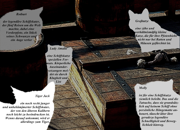Und auch an Bord ihrer Schiffe, meist in den von den von den Menschen wenig besuchten Laderäumen ergaben sich unter den kätzischen Seeleuten immer wieder Gründe, dienstliche und private Angelegenheiten ausgiebig zu besprechen. Eine solche Dienstbesprechung zeigt das Bild*. Die Katzen, die hier nur als Schemen dargestellt sind, könnten Ihre von Jonathan Petry liebevoll hineingezeichneten Fellnasen sein, die damit im Rahmen der Illustration (im Buch schwarz/weiß; Kunstdruck und Grußkarten farbig) in die Schiffskatzengeschichte des legendären Rotbart eingehen.