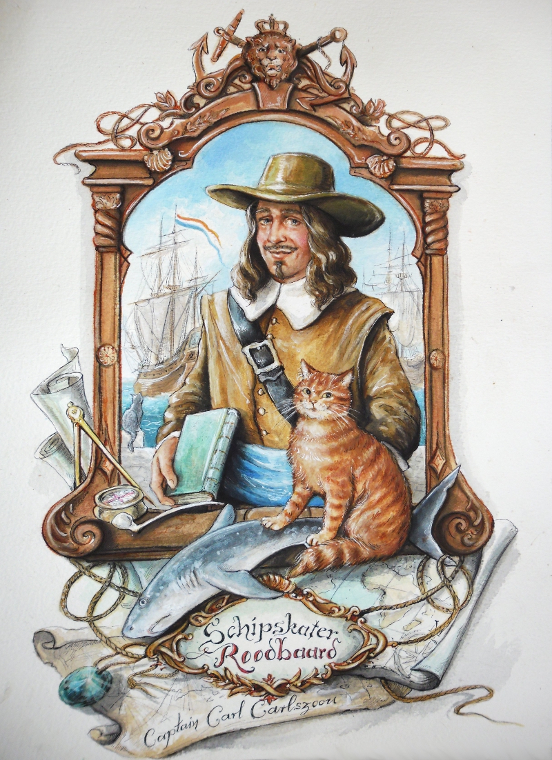 Und dann ist da noch Peppy, der als direkter Nachfahre vom Schiffskater Rotbart in Cape Town geboren wurde und dort ebenfalls an Bord der Endeavour gehen wird. Jonnys Peppy ist Ostern 2016 ganz unerwartet im Alter von nur 5 Jahren über die Regenbogenbrücke gegangen. Und aus diesem Anlass wird auch das hier gezeigte wunderbare Bild, das ich Euch hier vorstellen darf, in seinem Buch vertreten sein. Das Motiv bezieht sich übrigens auf die legendäre Geschichte von Rotbart und dem Hai (Rotbarts 2. Reise) und ich bin wahnsinnig stolz, dass mein legendärer Schiffskater Eingang in Jonnys Werk gefunden hat.