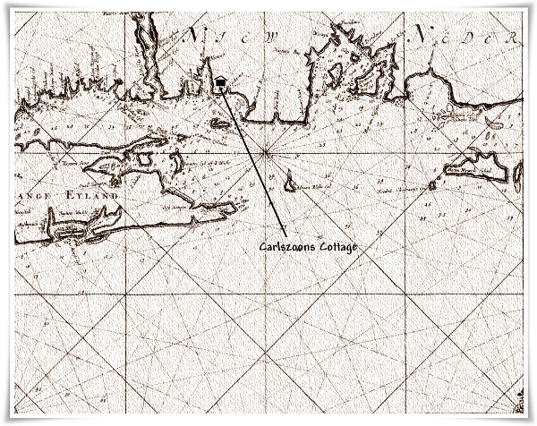 „Nein Danke“, antwortete ich geistesabwesend und starrte auf meine noch unbenutzte Serviette. Eine Skizze, die aussah wie eine Karte aus dem 17. Jahrhundert war darauf abgebildet. Beim genaueren Hinschauen erkannte ich den Beschriftung „Niew Nederland“ und die Skizze einer Hütte auf die ein Pfeil mit der hingekritzelten Bezeichnung „Carlszoons Cottage“ wies. Der geneigte Leser mag sich vorstellen, dass nun meine Neugierde geweckt war, zumal sich das Papier durchaus nicht anfühlte, wie das einer Serviette.