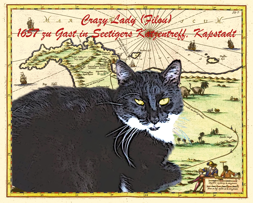 Filou – Crazy Lady: Wie genau die elegante Katze zur Seefahrt gekommen ist, weiß niemand. Fakt ist, dass sie seit den 1650er Jahren in so ziemlich jeder Katzenspelunke auf der Welt angetroffen werden konnte. Legendäre Gelage und wilde Streiche mit ihren Artgenossen an Bord und an Land waren ihr Markenzeichen. Als Schiffskatze war sie bei den Zweibeinern ein wenig in Verruf geraten, seit sie sich angewöhnt hatte, die dünnen Leinen, mit den Senkblei zum Loten der Wassertiefe heimlich in handliche Stücke zu zerknabbern.