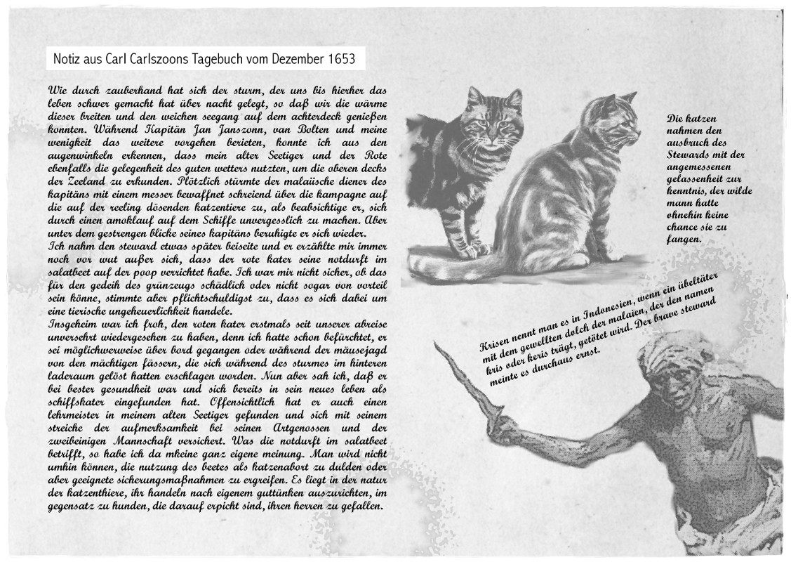 Schon zum Buch „Das Vermächtnis des Kapitäns Carl Carlszoon“ hatte Max alias Käptn Grotebroer bei dem legendären Schiffskater Rotbart angeheuert. Nun ist er auch auf der ersten Reise dabei, wie die historische „Musterrolle der Mitglieder von Rotbarts vierbeiniger Mannschaft, angeheuert für die Reise nach Ostindien, die im Jahre 1663 auf der Reede von Texel begann und 1657 in Amsterdam endete.“ belegt. Auf dem mir vorliegenden Original unter „Name/ Schiffsvierbeinername“ an zweiter Position deutlich zu erkennen: Max/Käptn Grotebroer und dahinter die eindeutige Pfotensignatur. Weiterlesen →