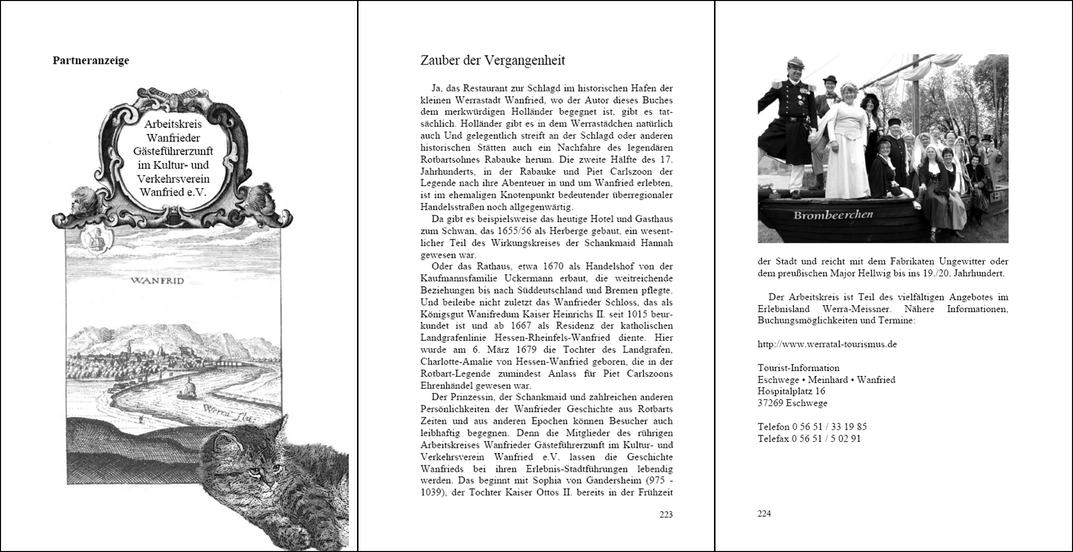 Ja, das Restaurant zur Schlagd im historischen Hafen der kleinen Werrastadt Wanfried, wo der Autor dieses Buches dem merkwürdigen Holländer begegnet ist, gibt es tatsächlich. Holländer gibt es in dem Werrastädtchen natürlich auch. Und gelegentlich streift an der Schlagd oder anderen historischen Stätten auch ein Nachfahre des legendären Rotbartsohnes Rabauke herum. Da bietet es sich geradezu an, dass die Stadt über den